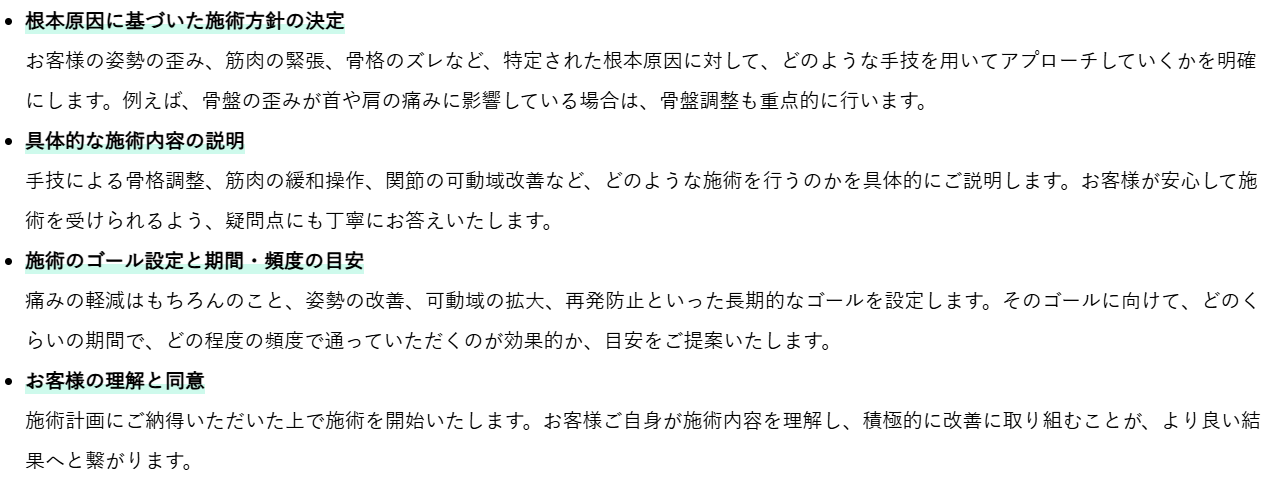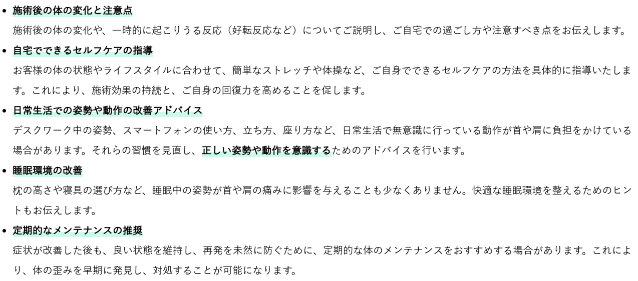 これらのアフターケアとアドバイスを通じて、お客様ご自身が健康な体を維持する意識を高め、痛みに悩まされない生活を送れるようサポートいたします。