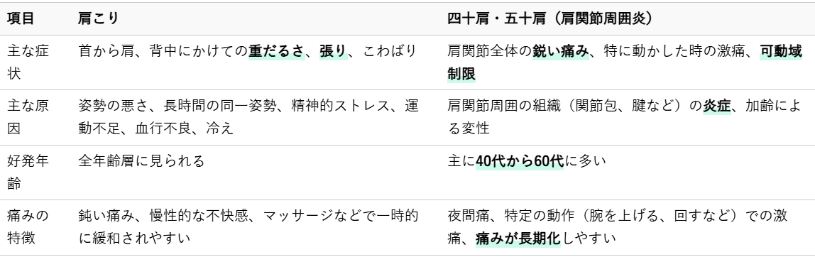 肩の痛みと一口に言っても、「肩こり」と「四十肩・五十肩」では、その性質や原因が大きく異なります。ご自身の痛みがどちらに当てはまるのかを理解することは、適切な対処法を見つける上で非常に重要です。
