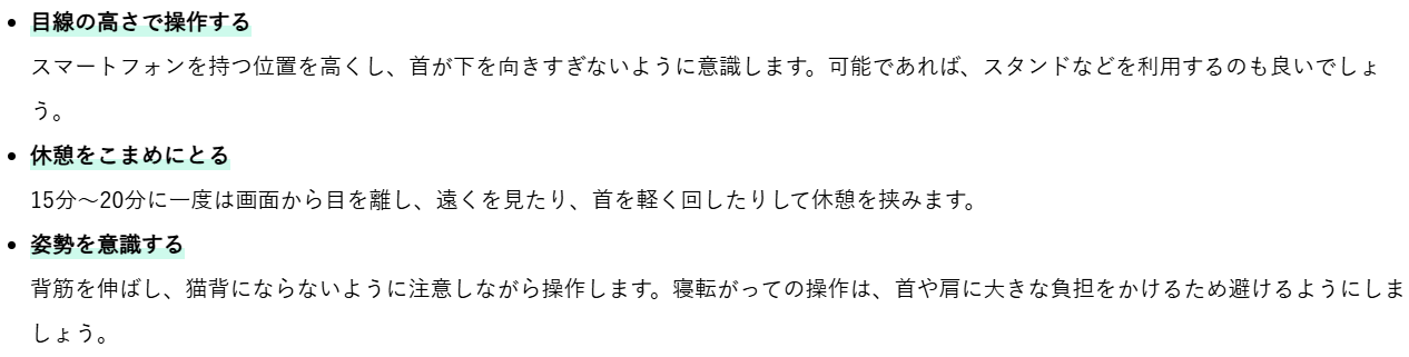 スマートフォンの長時間使用は、「スマホ首」とも呼ばれる首の痛みの大きな原因となります。以下の点に注意して、首への負担を減らしましょう。