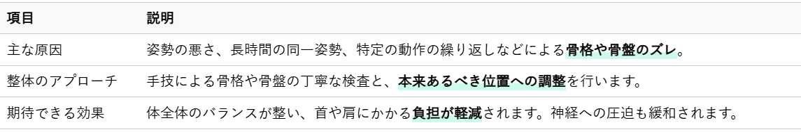首や肩の痛みは、日々の姿勢や生活習慣、精神的なストレスなど、様々な要因が複雑に絡み合って生じることが多いです。一時的な対処ではなく、整体で骨格の歪みや筋肉の緊張といった根本原因にアプローチすることで、つらい症状の改善が期待できます。
