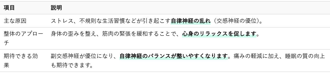 整体の施術は、直接的に自律神経に働きかけるものではありませんが、身体の歪みを整え、硬くなった筋肉を緩めることで、心身全体のリラックスを促す効果が期待できます。体がリラックスすることで、副交感神経が優位になりやすくなり、自律神経のバランスが自然と整いやすくなります。これにより、痛みの軽減だけでなく、睡眠の質の向上や精神的なストレスの緩和にも繋がり、体本来の回復力を高めることができるのです。