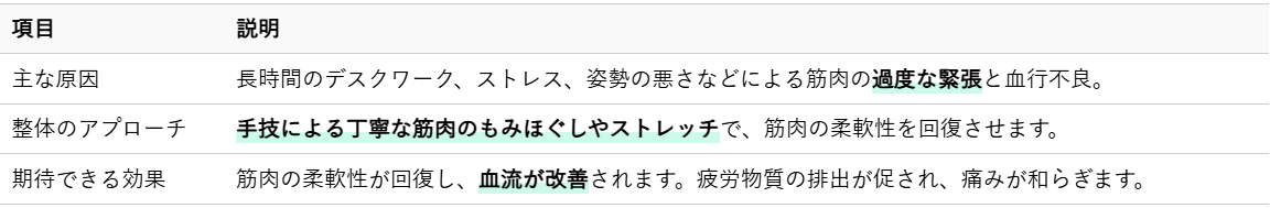このように、お客様一人ひとりの状態に合わせたきめ細やかな施術計画を立てることで、首や肩の痛みの根本改善を目指します。