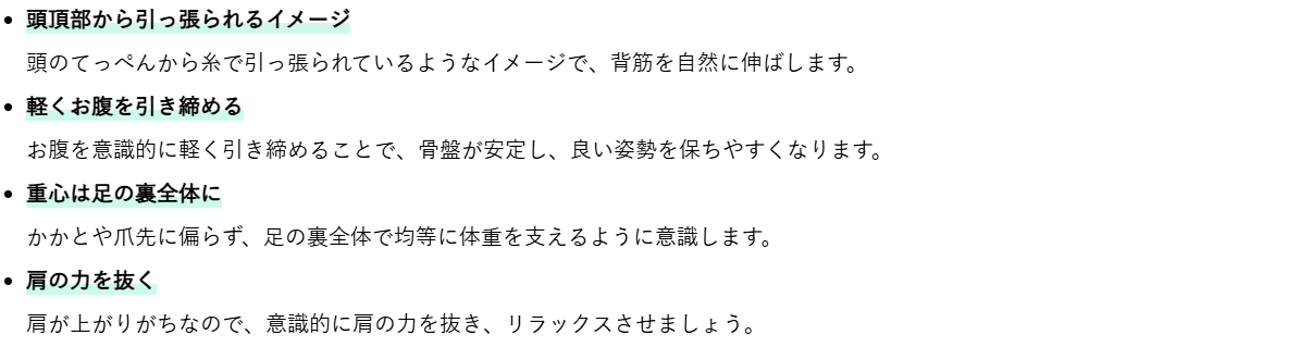 立っている時も、重力の影響で身体には常に負担がかかっています。正しい立ち姿勢を意識することで、身体のバランスが整い、首や肩への負担が軽減されます。
