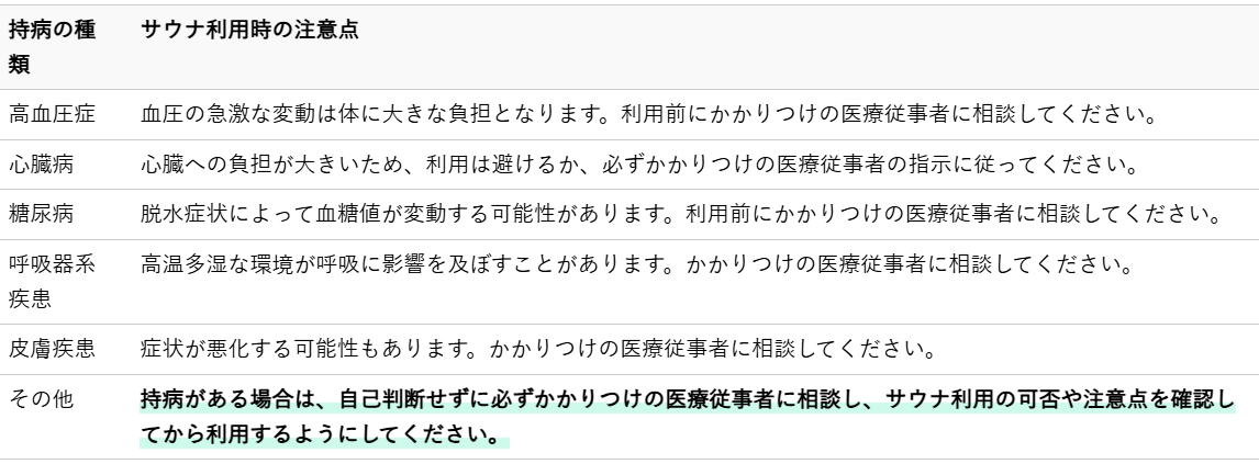 また、持病をお持ちの方は、サウナの利用によって体調が急変するリスクがあります。サウナは血圧の急激な変動を引き起こしたり、心臓に負担をかけたりすることがあるため、以下のような持病がある場合は特に注意が必要です。
