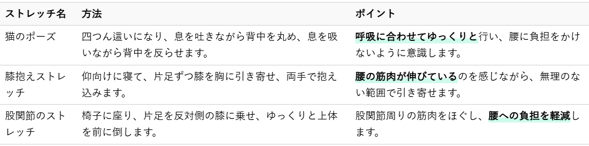 ここでは、腰痛改善に役立つ簡単なストレッチの例をご紹介します。無理のない範囲で、ゆっくりと丁寧に行いましょう。