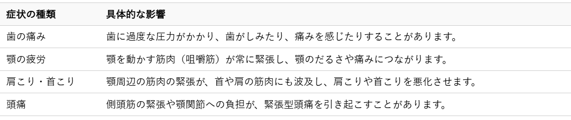 さらに、ストレスと深く関連しているのが、歯ぎしりや食いしばりです。これらは「ブラキシズム」とも呼ばれ、睡眠中や日中の集中時、緊張している時などに無意識のうちに行われることが多いです。歯ぎしりや食いしばりは、自分の体重の何倍もの力が歯や顎にかかるため、以下のような様々な問題を引き起こします。