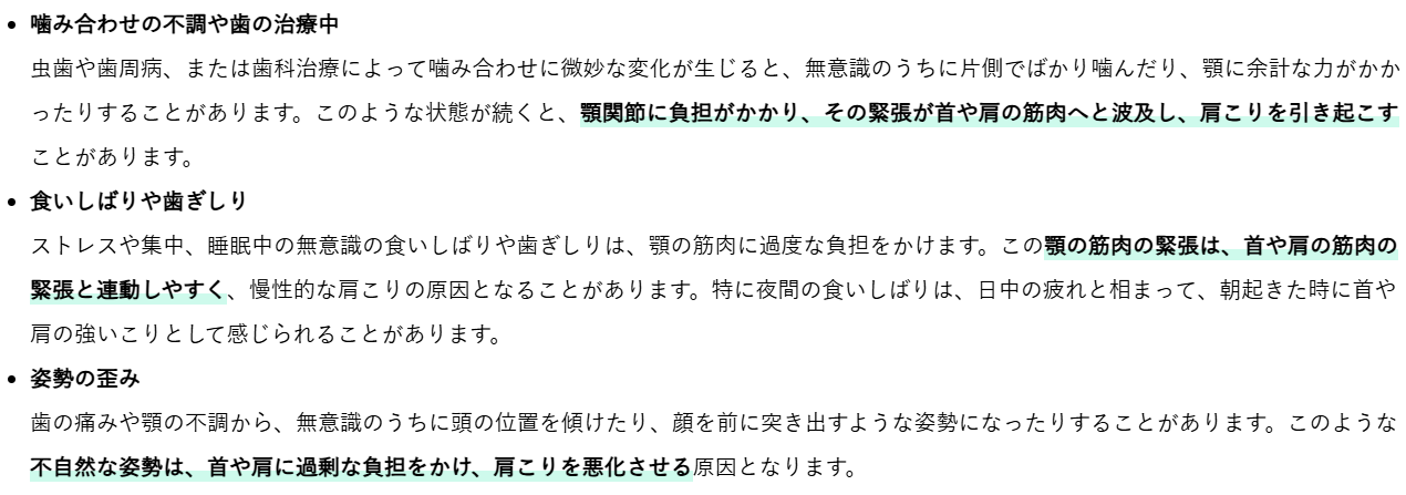 歯の痛みや顎の不調が、結果として肩こりを引き起こすこともあります。以下のような状況が考えられます。
