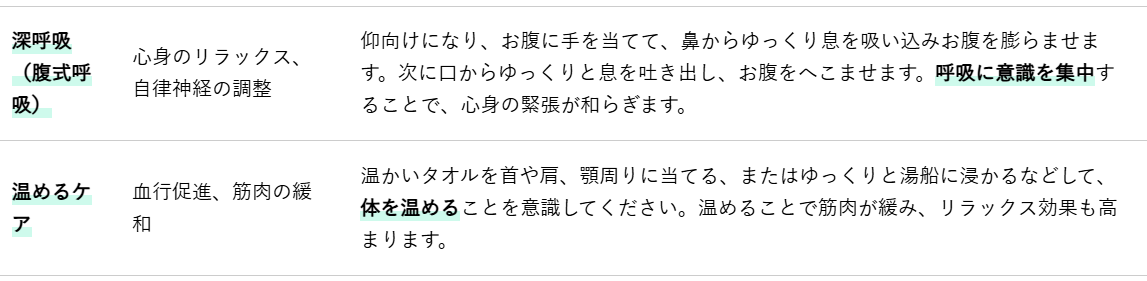 筋肉の緊張を和らげ、血行を促進するためのストレッチや、心身のリラックスを促す方法は、肩こりや歯の痛みの緩和に役立ちます。無理のない範囲で、毎日少しずつでも継続することが大切です。