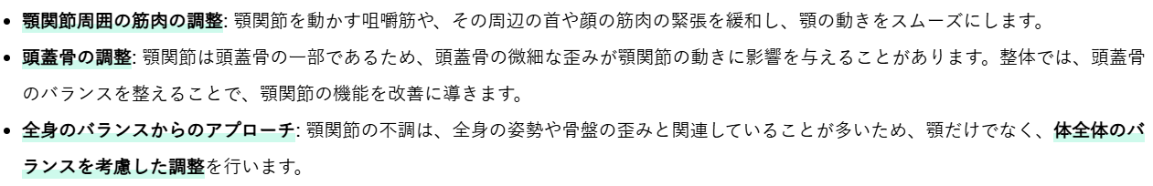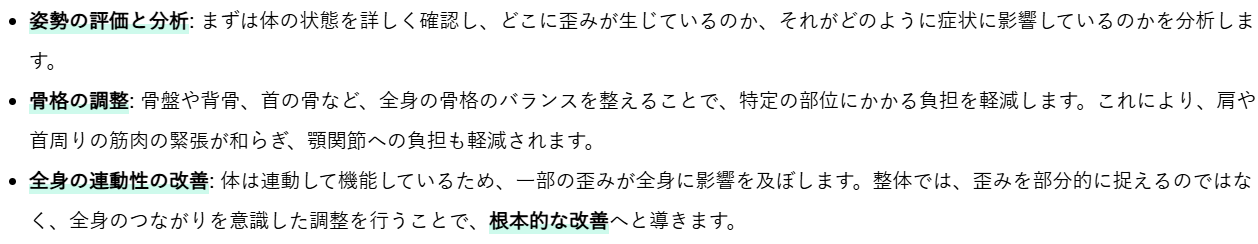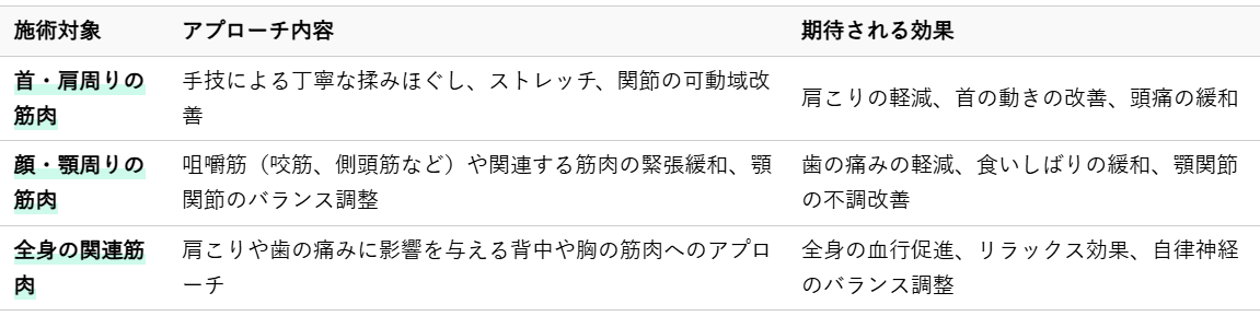 整体では、顎関節のバランスを整えるために、以下のようなアプローチを行います。