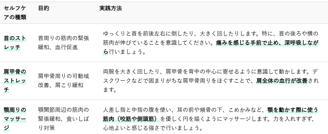 整体での施術に加え、日々の生活の中でご自身でできるセルフケアを取り入れることで、肩こりや歯の痛みの改善をさらに促進し、快適な状態を維持することができます。ここでは、手軽に実践できるセルフケアの方法をご紹介します。