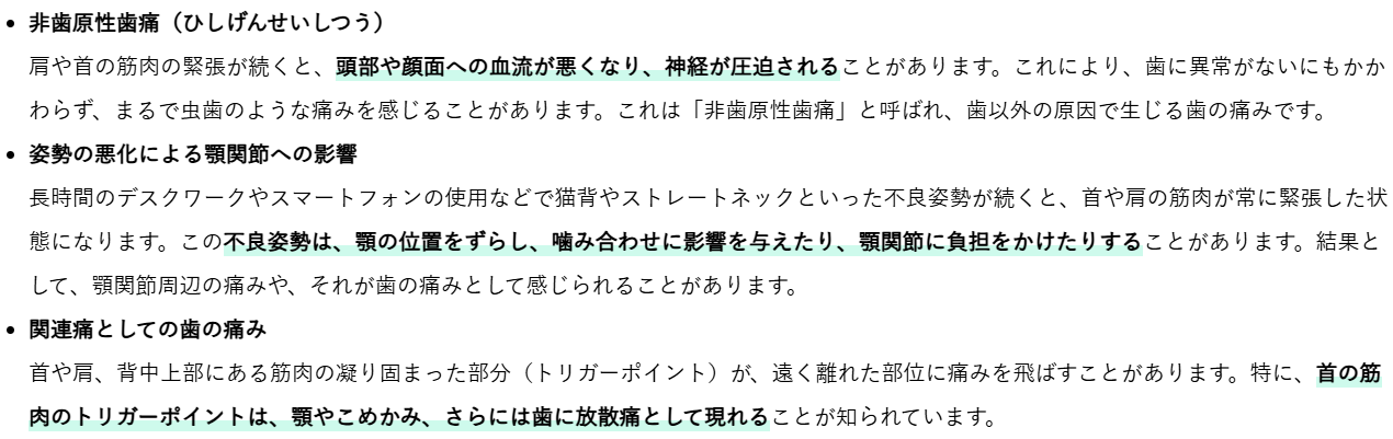 このように、ストレスが引き起こす無意識の食いしばりは、歯や顎だけでなく、首や肩にも大きな負担をかけ、肩こりと歯の痛みの両方の根本原因となり得るのです。