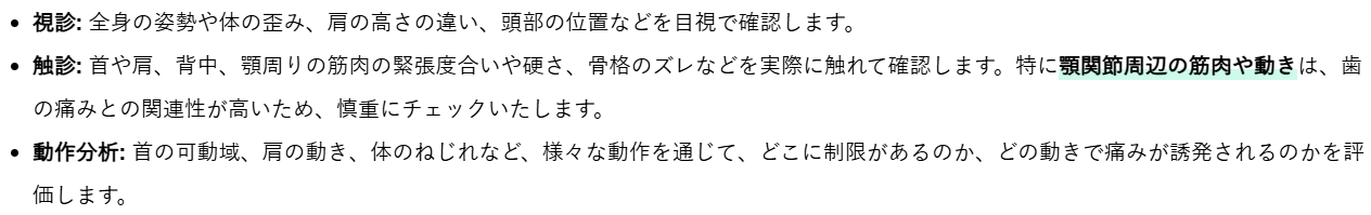 これらのカウンセリングと検査を通じて、お客様の肩こりや歯の痛みがどこから来ているのか、その根本的な原因を特定し、今後の施術プランを立てるための大切な土台を築きます。