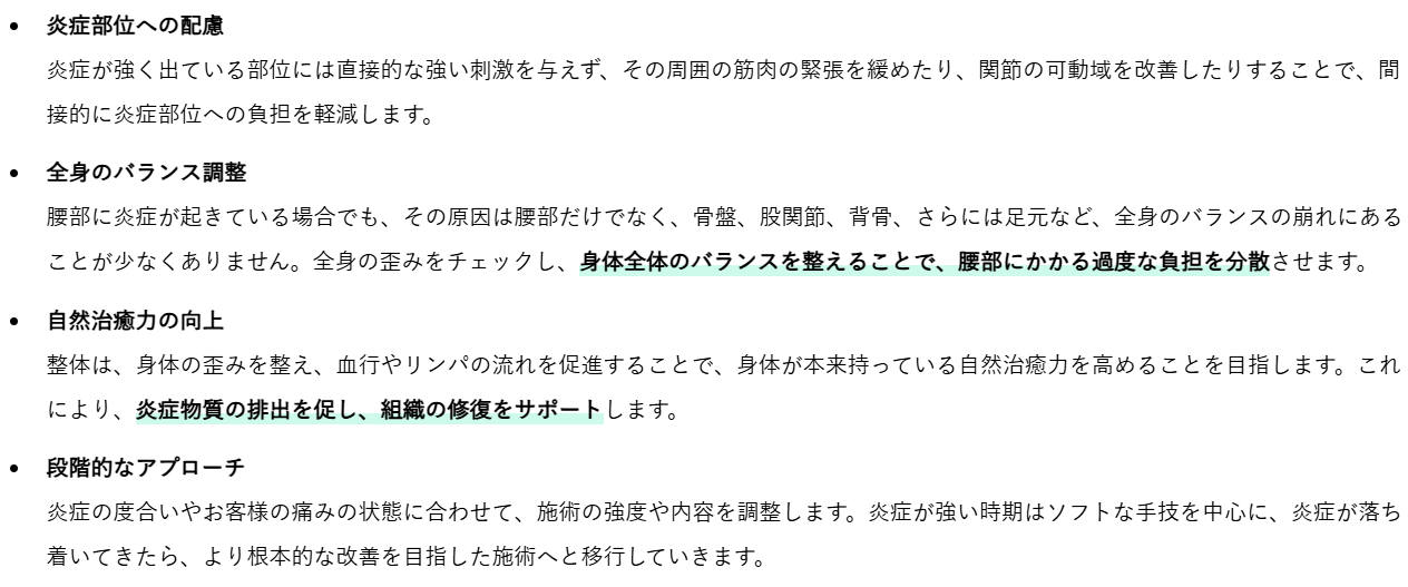 ここでは、整体が炎症性腰痛に対して具体的にどのような考え方で施術を進めていくのか、そのアプローチについて詳しくご説明いたします。