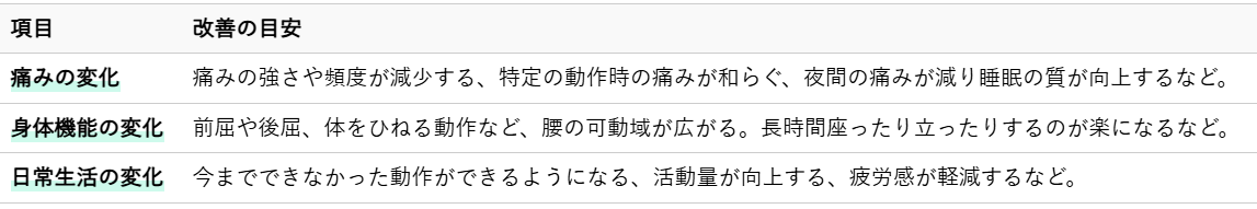 整体による腰痛の炎症改善には個人差がありますが、一般的には以下のような変化が改善の目安となります。