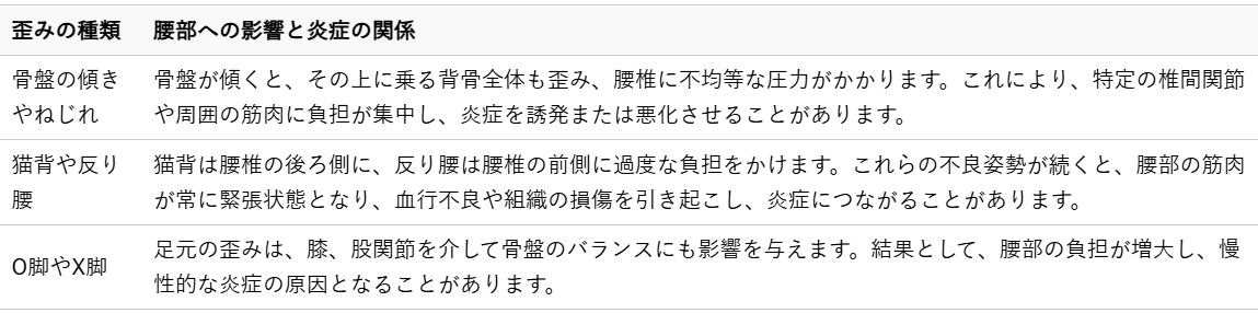 この歪みが原因で、特定の腰部の筋肉や関節に継続的に過度な負担がかかり、それが炎症を引き起こしたり、既存の炎症を悪化させたりすることがあります。例えば、以下のような関係性が考えられます。