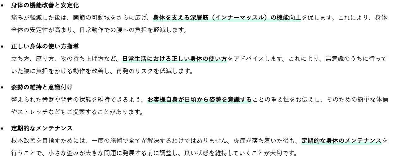 腰痛の炎症が落ち着き、痛みが和らいだ後も、整体の役割は終わりではありません。むしろ、ここからが再発を防ぎ、根本的な改善を目指す上で非常に重要な段階となります。