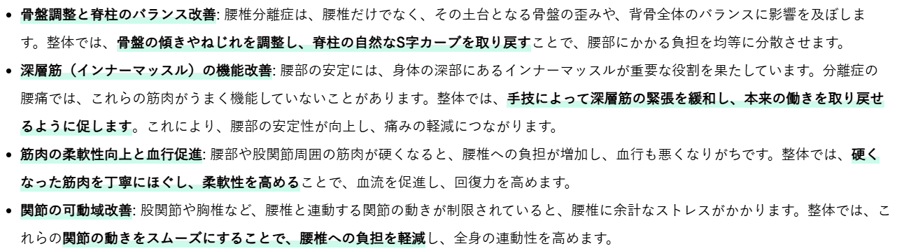 整体の施術は、分離症による腰痛の改善において、骨格と筋肉のバランスを整えることに重点を置いています。具体的な手技を通じて、以下のようなアプローチを行います。