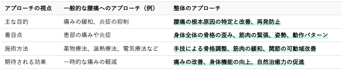 腰痛の治療法は多岐にわたりますが、そのアプローチには大きな違いがあります。一般的なアプローチが、痛みの症状緩和に重点を置くことが多いのに対し、整体は身体全体のバランスと機能の改善を重視します。