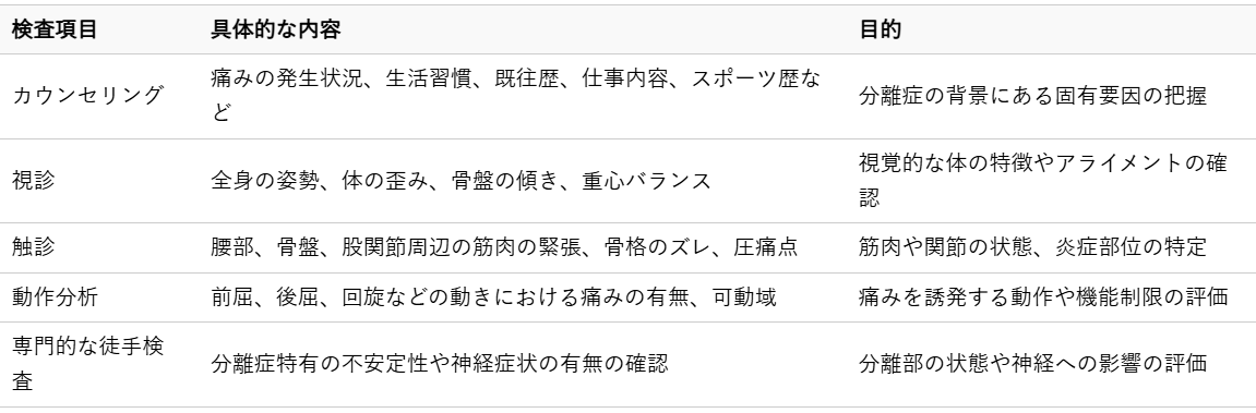 次に、専門的な検査を行います。視診では全身の姿勢や体の歪み、左右のバランスなどを確認し、触診では腰部だけでなく、骨盤や股関節、背中など関連する部位の筋肉の緊張具合や骨格のズレ、圧痛点などを細かくチェックします。さらに、動作分析によって、どの動きで痛みが生じるのか、関節の可動域はどの程度か、体幹の安定性はどうなっているかなどを評価します。これらの情報を総合的に分析することで、分離症による腰痛を引き起こしている真の原因を突き止めます。