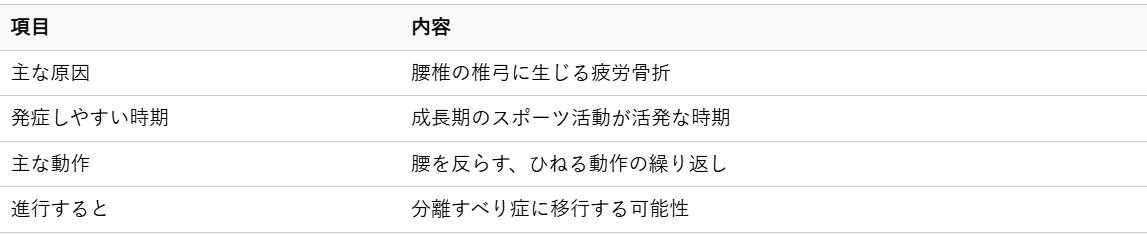 この症状は、特に成長期のスポーツ選手に多く見られます。骨がまだ完全に成熟していない時期に、ジャンプやランニング、投球などの激しい運動を繰り返すことで、腰椎に継続的なストレスがかかり発症しやすくなります。しかし、成長期を過ぎた成人でも、長年の姿勢の癖や特定の動作の繰り返しによって発症することもあります。