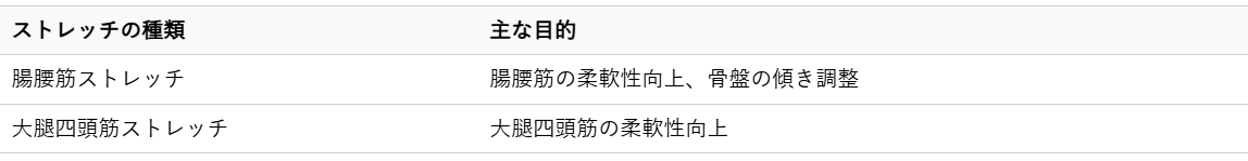 反り腰は、骨盤が過度に前傾し、腰椎のカーブがきつくなる姿勢で、腰に大きな負担をかけます。特に、股関節の前面にある腸腰筋や太ももの前面にある大腿四頭筋が硬いと、反り腰になりやすい傾向があります。反り腰を改善することで、腰椎の自然なカーブを取り戻し、椎間板への圧力を軽減することができます。ここでは、反り腰の改善に役立つストレッチとその主な目的を一覧でご紹介します。