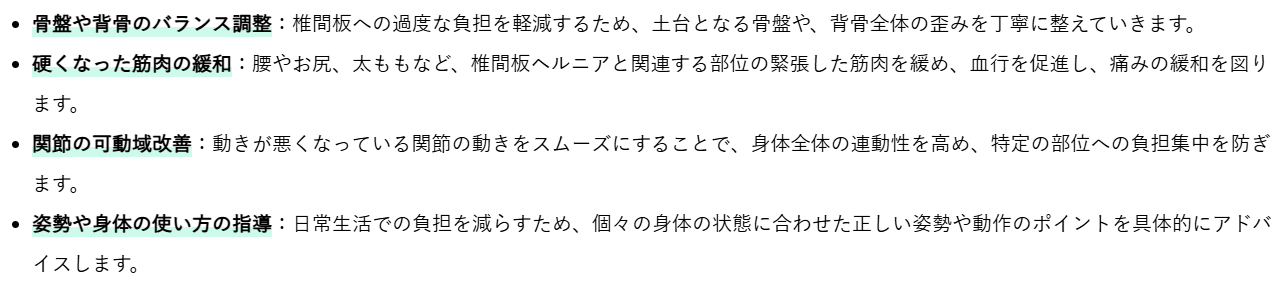 整体では、椎間板ヘルニアによる痛みやしびれの原因となっている身体の歪みや筋肉のアンバランスに対して、専門的な視点と手技でアプローチします。具体的には、以下のような調整を行います。