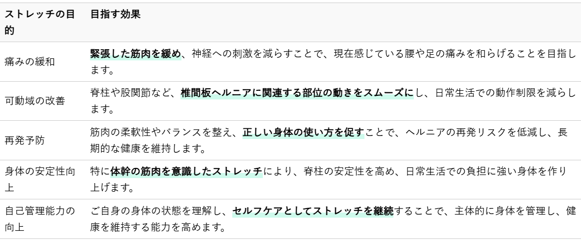 整体の専門家として、椎間板ヘルニアの方におすすめするストレッチには、明確な目的があります。単に身体を伸ばすだけでなく、根本的な改善と健康な身体づくりを目指します。