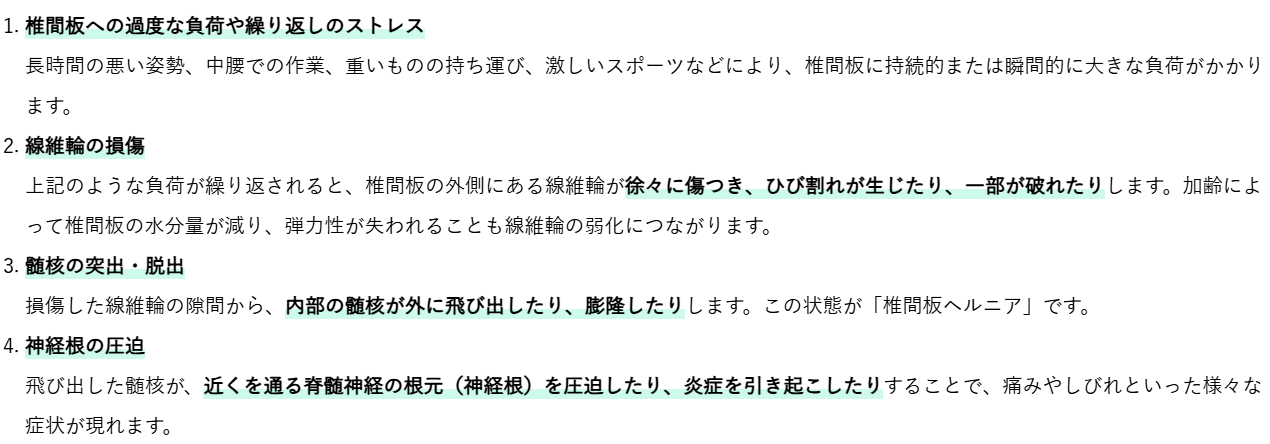 椎間板ヘルニアが起こる主なメカニズムは以下の通りです。