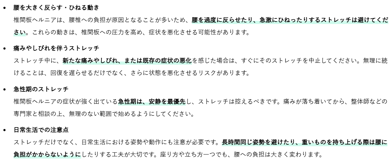 椎間板ヘルニアの症状は人それぞれ異なり、症状の程度や部位によって避けるべき動きがあります。特に、急性期や痛みが強い時期は、ストレッチ自体を控えるべき場合もあります。