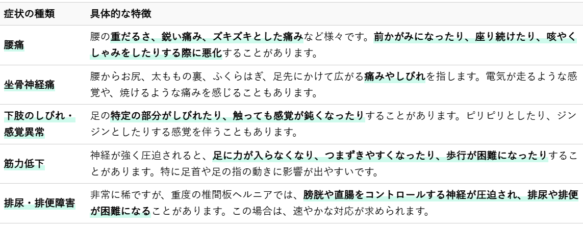 椎間板ヘルニアの症状は、飛び出した椎間板がどの神経を圧迫するかによって異なりますが、主に腰や下肢に痛みやしびれが生じることが多いです。具体的な症状は以下の通りです。
