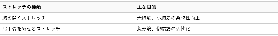 猫背は、背中が丸まり、肩が内側に入り込む姿勢で、首や肩、そして腰にまで負担をかけます。特に、胸椎の柔軟性が低下し、胸部の筋肉が硬くなることで、腰椎への負担が増加することがあります。猫背を改善することで、背骨全体のS字カーブを保ちやすくなり、椎間板への圧力を均等に分散できます。ここでは、猫背の改善に役立つストレッチとその主な目的を一覧でご紹介します。