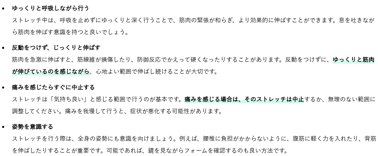 椎間板ヘルニアの改善を目指すストレッチは、ただやみくもに行うだけでは効果が得られにくく、かえって症状を悪化させてしまう可能性もあります。ここでは、整体師の視点から、ストレッチを安全かつ効果的に行うための重要なポイントを詳しくご紹介いたします。