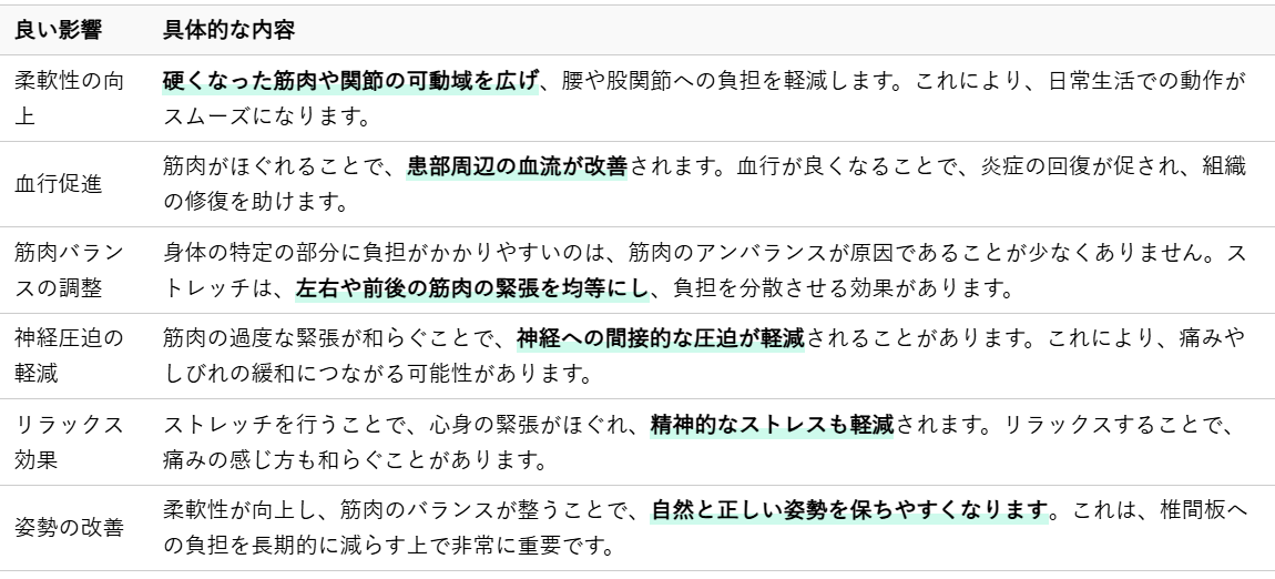 ストレッチは、硬くなった筋肉や関節に働きかけ、身体本来の機能を取り戻す手助けをします。椎間板ヘルニアにおいては、特に次のような良い影響が期待できます。