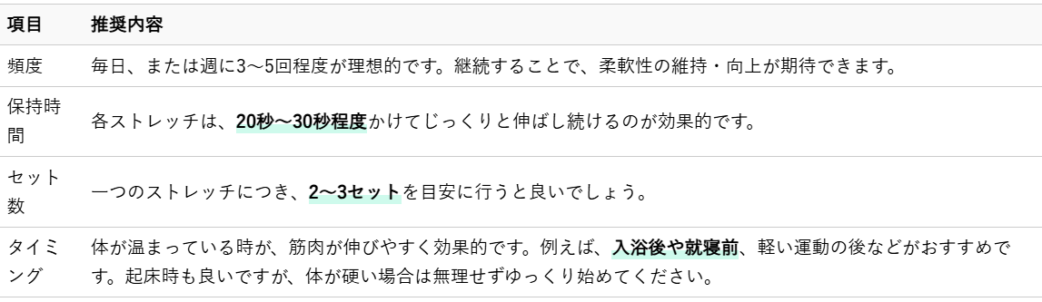 ストレッチは、一度に長時間行うよりも、継続して行うことが大切です。日常生活に無理なく取り入れられる範囲で、習慣化を目指しましょう。
