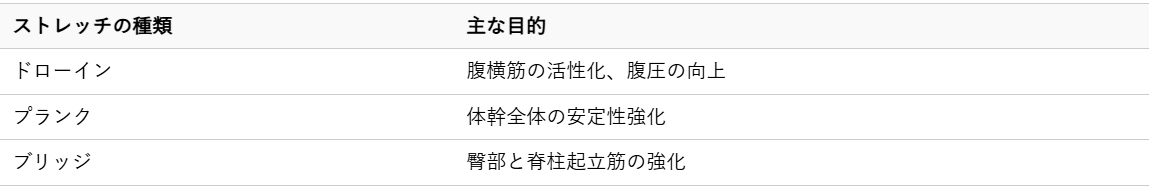 腰椎の安定性を高め、椎間板への負担を軽減するための体幹ストレッチは、椎間板ヘルニアの改善と予防に非常に重要です。体幹を強化することで、日常動作における腰への負担が軽減され、症状の悪化を防ぐことができます。ここでは、特に効果的な体幹ストレッチとその主な目的を一覧でご紹介します。