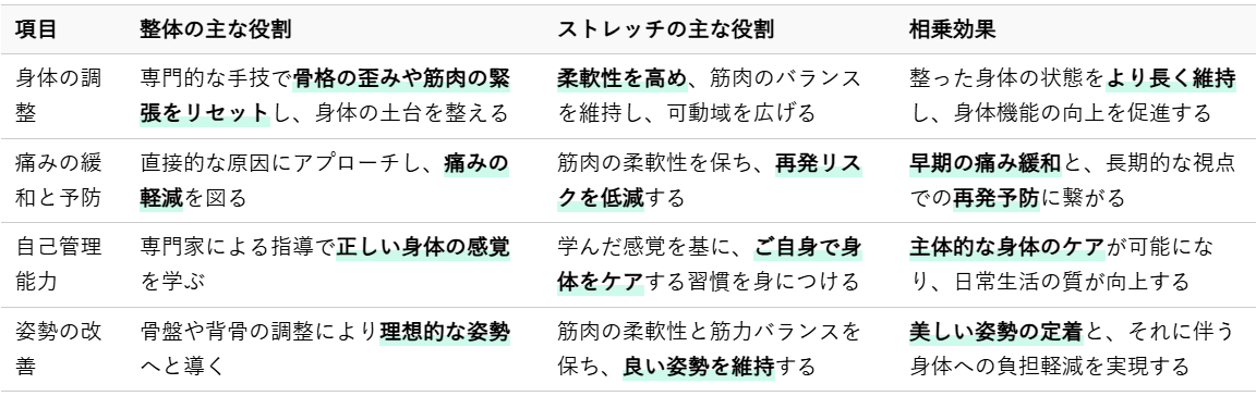 整体で専門的な調整を受けた後に、ご自身で適切なストレッチを継続することで、その効果は飛躍的に高まります。両者を組み合わせることで得られる主なメリットは以下の通りです。