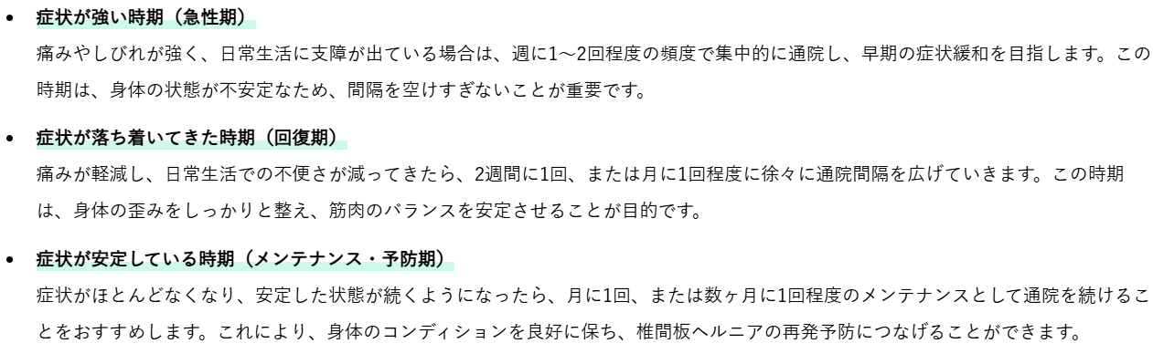 整体の通院頻度は、椎間板ヘルニアの症状の程度、発症からの期間、個人の回復力などによって大きく異なります。一般的な目安としては、以下のようになります。