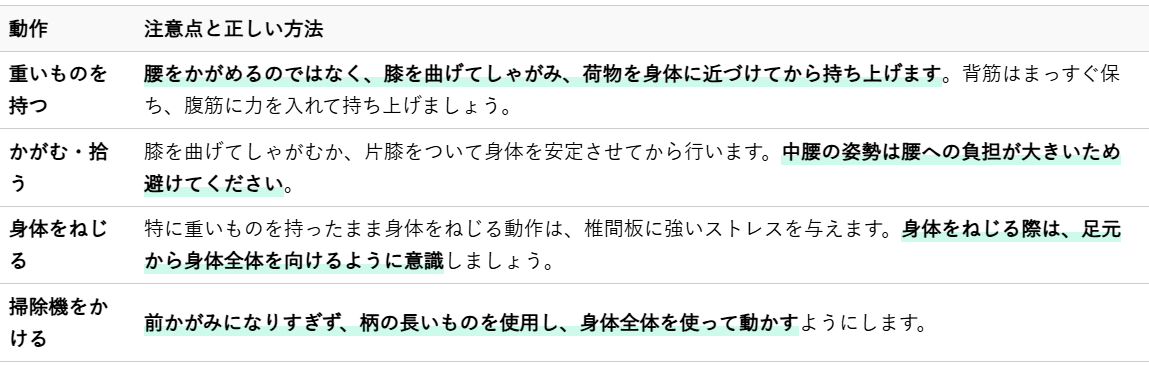 日常生活の何気ない動作が、椎間板に大きな負担をかけることがあります。特に、重いものを持つ際やかがむ際には注意が必要です。