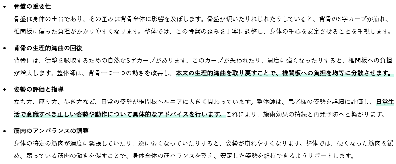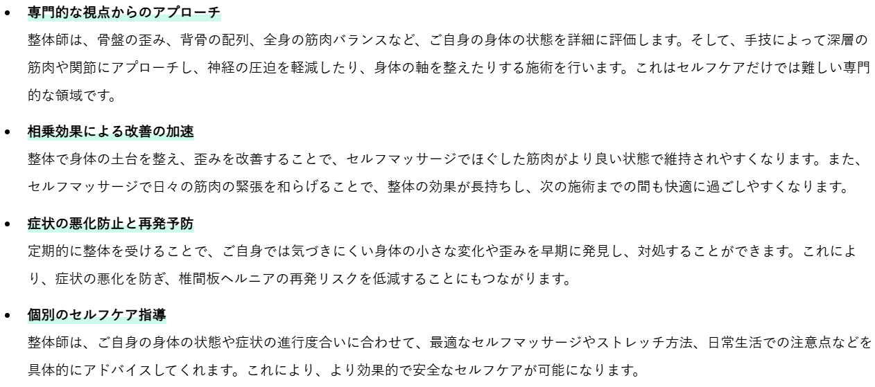 セルフマッサージで日々のケアを行うことは非常に有効ですが、椎間板ヘルニアの根本的な改善には、専門家である整体師による施術が大きな役割を果たします。整体とセルフケアを併用することで、より確実で持続的な改善を目指すことができます。