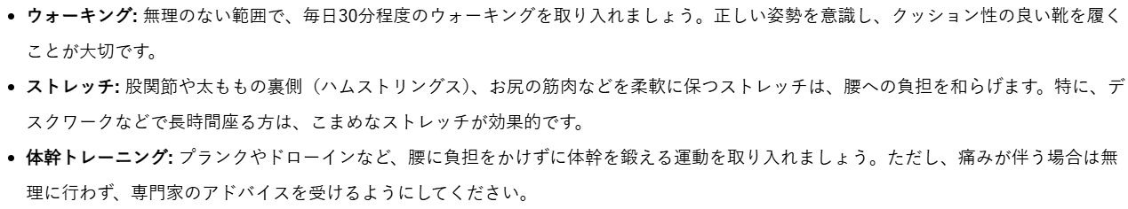 椎間板ヘルニアの予防には、適度な運動と体幹(インナーマッスル)の強化が非常に有効です。体幹が安定することで、腰への負担が軽減され、正しい姿勢を維持しやすくなります。