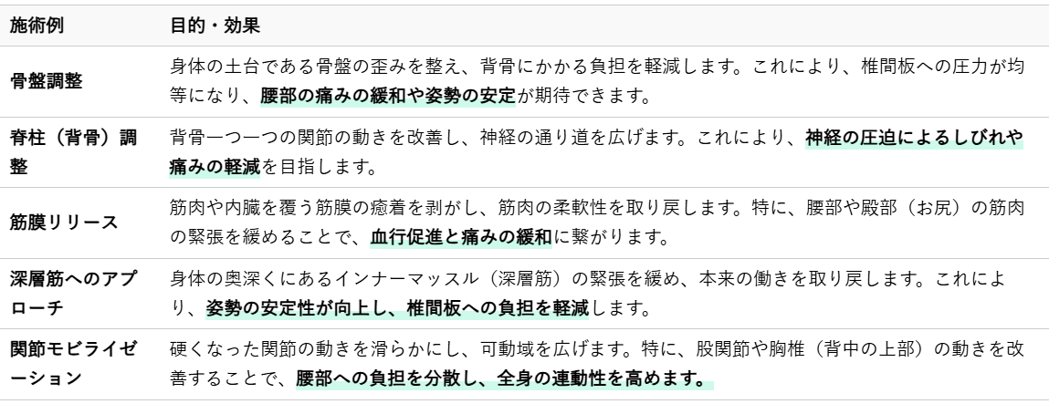 整体院では、椎間板ヘルニアの症状を緩和するために、様々な手技を組み合わせて行います。以下に、代表的な施術例とその目的をご紹介します。
