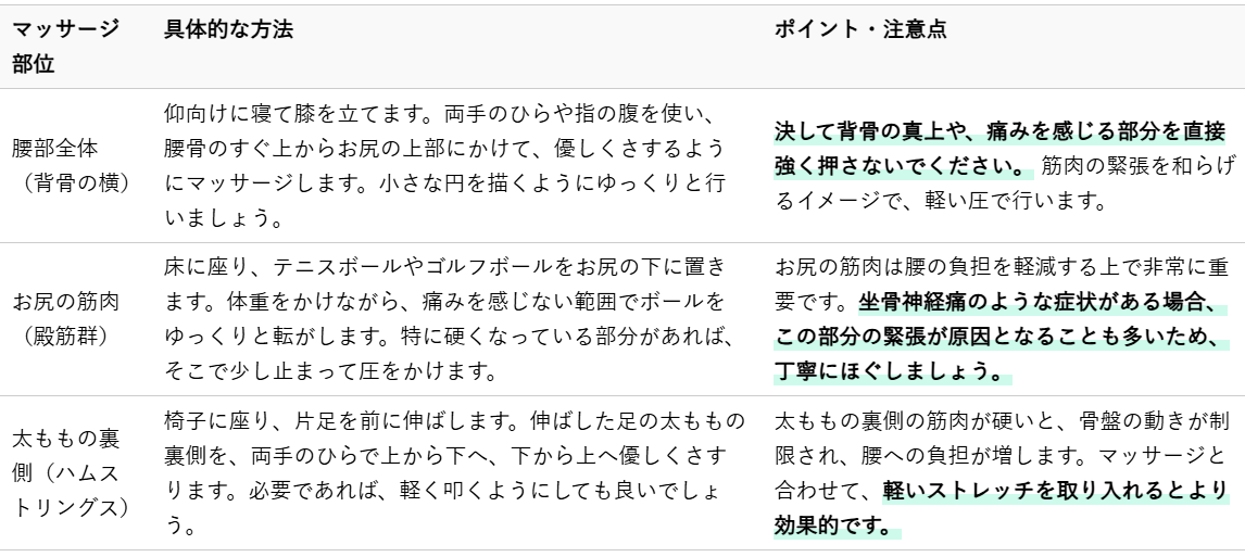椎間板ヘルニアの痛みの原因は、神経の圧迫だけでなく、その周囲の筋肉の過緊張や血行不良も大きく関わっています。セルフマッサージは、筋肉の緊張を和らげ、血行を促進することで、症状の緩和や回復のサポートを目的とします。 ただし、直接的な患部への強い刺激は避け、あくまで周辺の筋肉を優しくほぐすことが重要です。