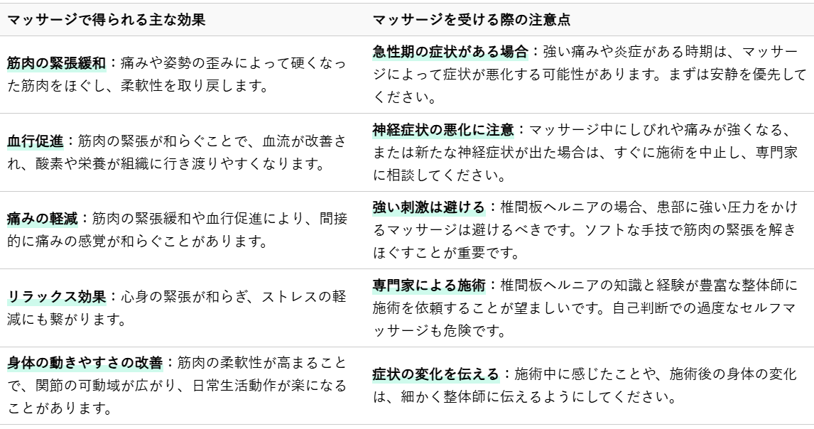 椎間板ヘルニアに対するマッサージは、症状の緩和や身体機能の改善に役立つ一方で、注意すべき点もあります。ここでは、マッサージで期待できる主な効果と、施術を受ける上での注意点をまとめました。