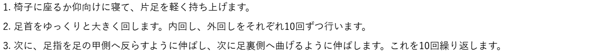 この運動を左右の足でそれぞれ行いましょう。足首と足指の連動性を高め、足全体の血行を促進します。特に、足がむくみやすい方にもおすすめです。