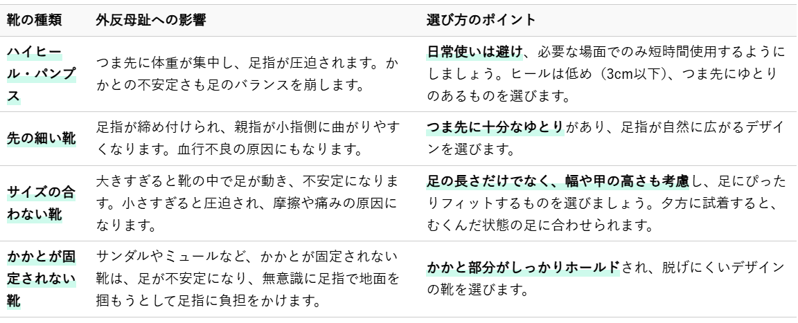 外反母趾の大きな原因の一つは、足に合わない靴を履き続けることです。再発を防ぐためには、足に優しい靴を選ぶことが何よりも重要になります。