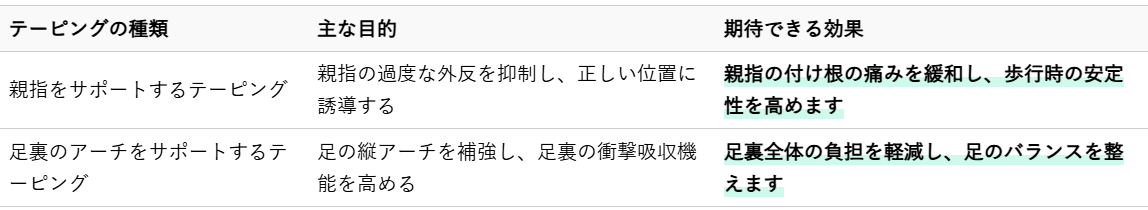 テーピングは、外反母趾によって不安定になった足の関節をサポートし、足にかかる負担を軽減しながら、正しい足の形を維持するのに役立ちます。一時的な痛みの緩和や、運動時の保護としても有効です。ここでは、自宅で簡単にできる基本的なテーピング方法をご紹介します。