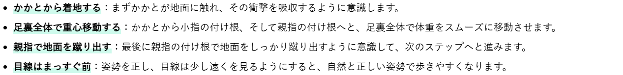 これらの歩き方は、足裏のアーチ構造を崩しやすく、外反母趾の症状を悪化させる可能性があります。理想的な歩き方は、次の点を意識することです。