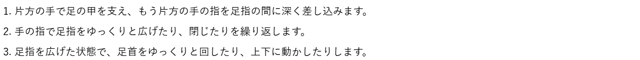 足指じゃんけんは、足指の柔軟性を高め、一本一本の指を意識して動かす練習に最適です。座った状態で行いましょう。