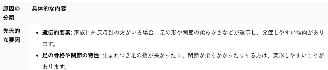 外反母趾になる原因は一つではなく、複数の要因が絡み合っていることがほとんどです。大きく分けて、生まれつきの足の形や遺伝による「先天的な要因」と、日々の生活習慣による「後天的な要因」があります。