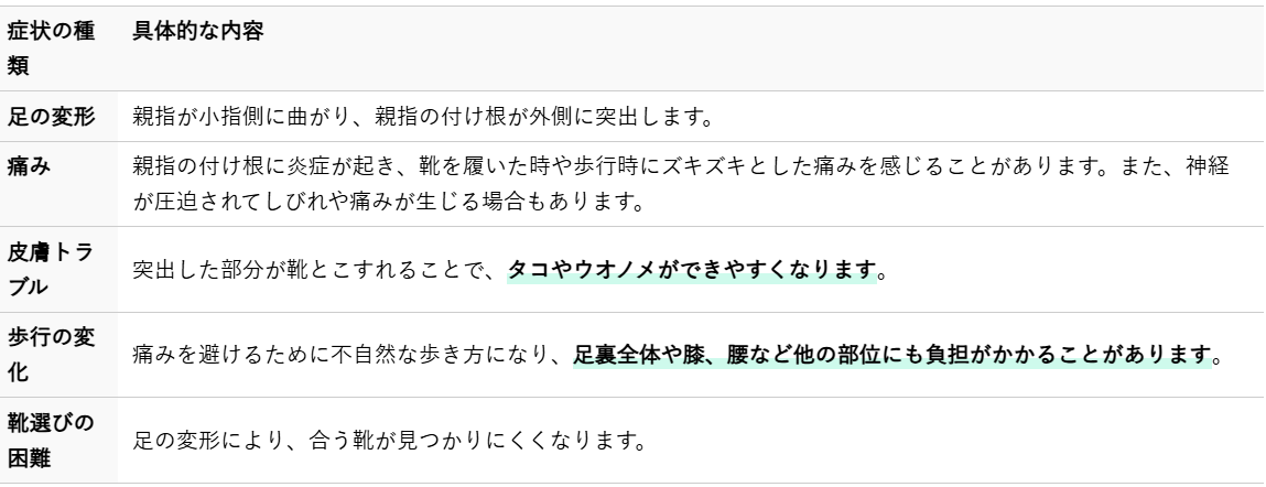 外反母趾は単なる見た目の問題だけでなく、足全体のバランスを崩し、歩行時の不快感や他の足のトラブルを引き起こす原因となることがあります。進行すると、足裏のアーチが崩れて扁平足になったり、足の指がうまく使えなくなり、不安定な歩き方になったりする可能性もあります。
